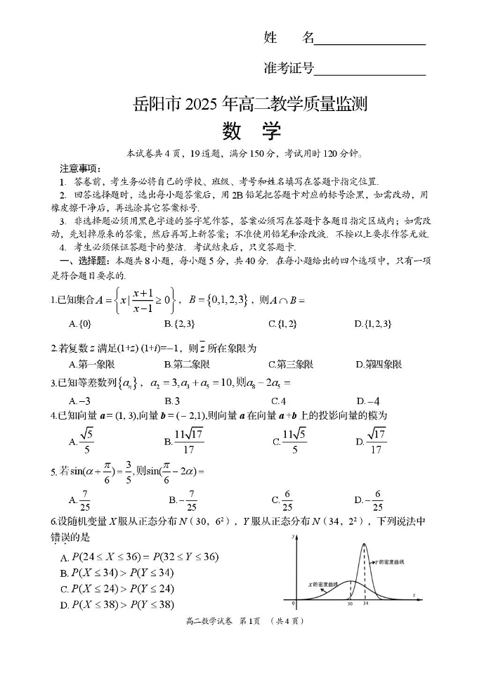 高二数学--湖南省岳阳市2024-2025学年高二下学期期末教学质量监测