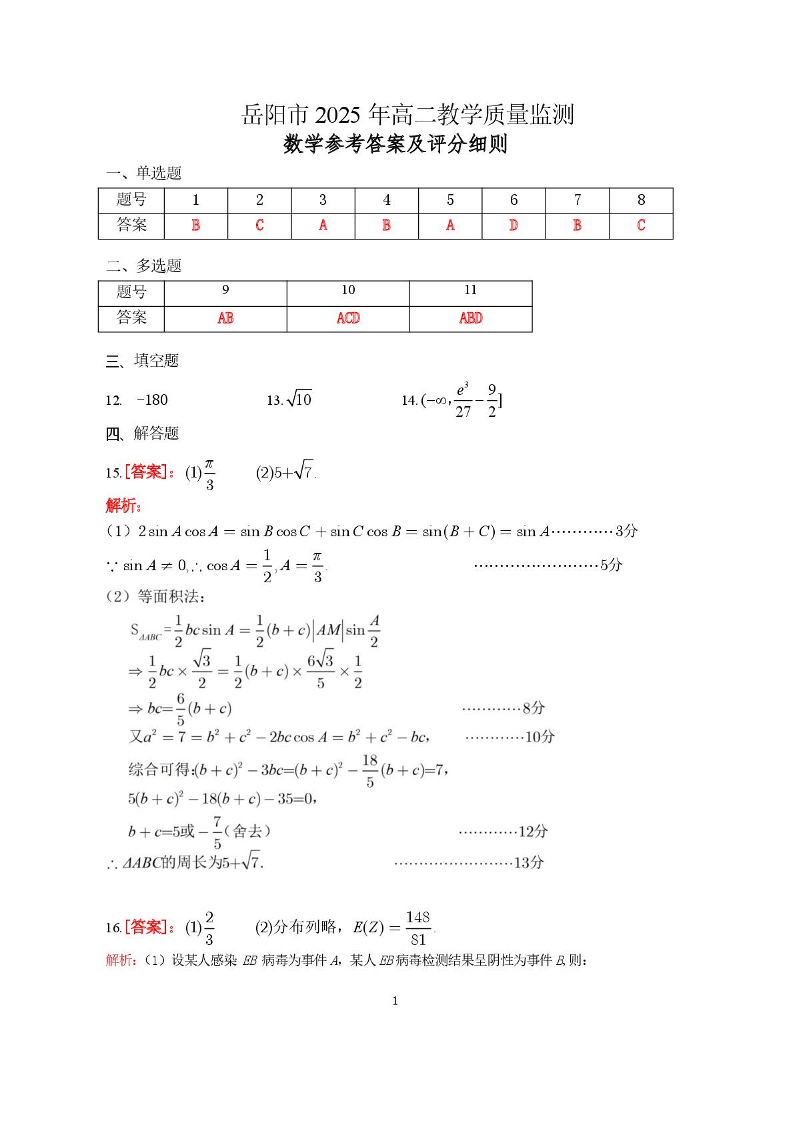 高二数学答案--湖南省岳阳市2024-2025学年高二下学期期末教学质量监测