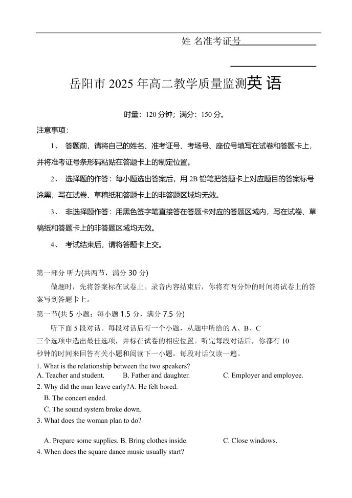 高二英语--湖南省岳阳市2024-2025学年高二下学期期末教学质量监测