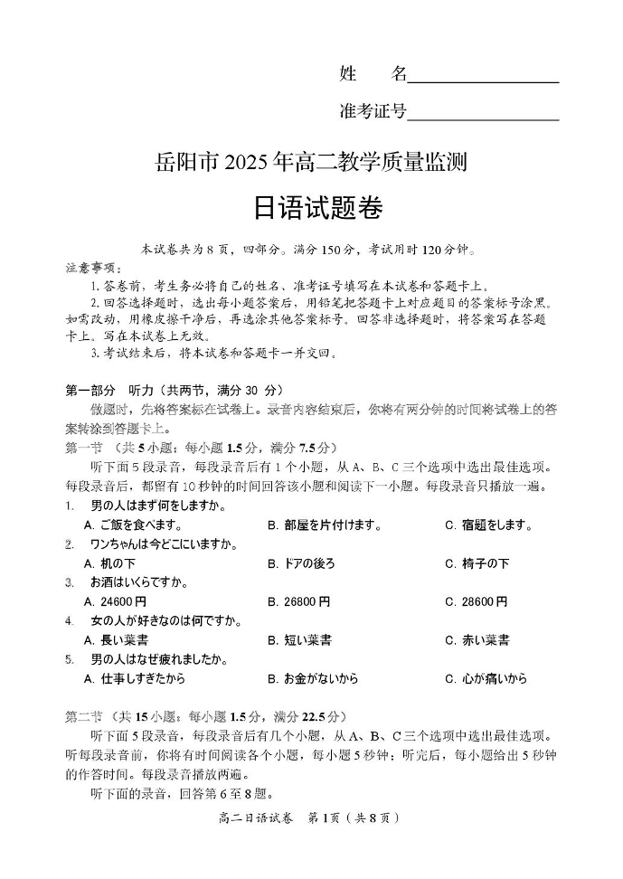 高二日语+答案--湖南省岳阳市2024-2025学年高二下学期期末教学质量监测