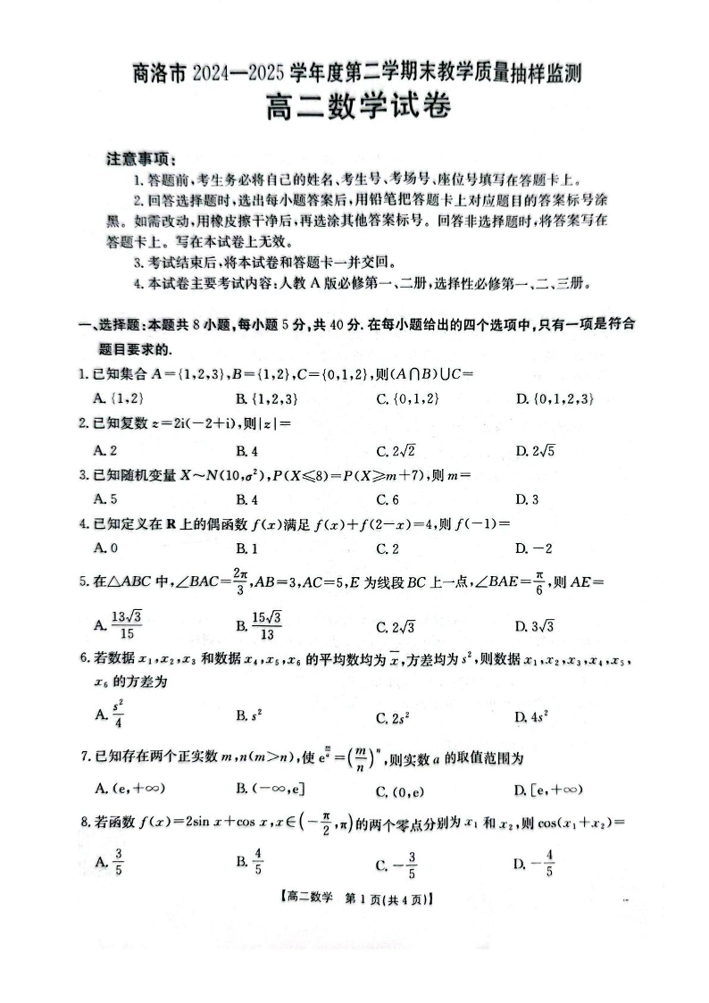 高二数学--陕西省商洛市2024-2025学年高二下学期期末