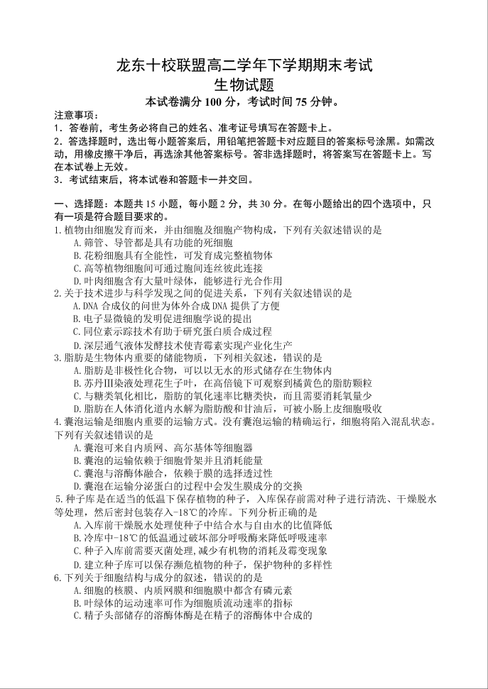 高二生物--黑龙江省龙东十校联盟2024-2025学年高二下学期期末考试