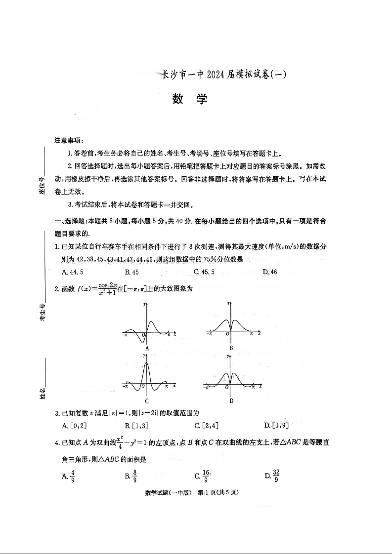 湖南省长沙市第一中学2024届高三模拟考试(一)数学