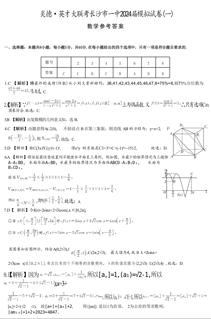 湖南省长沙市第一中学2024届高三模拟考试(一)数学答案