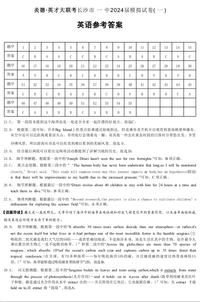 湖南省长沙市第一中学2024届高三模拟考试(一)英语答案