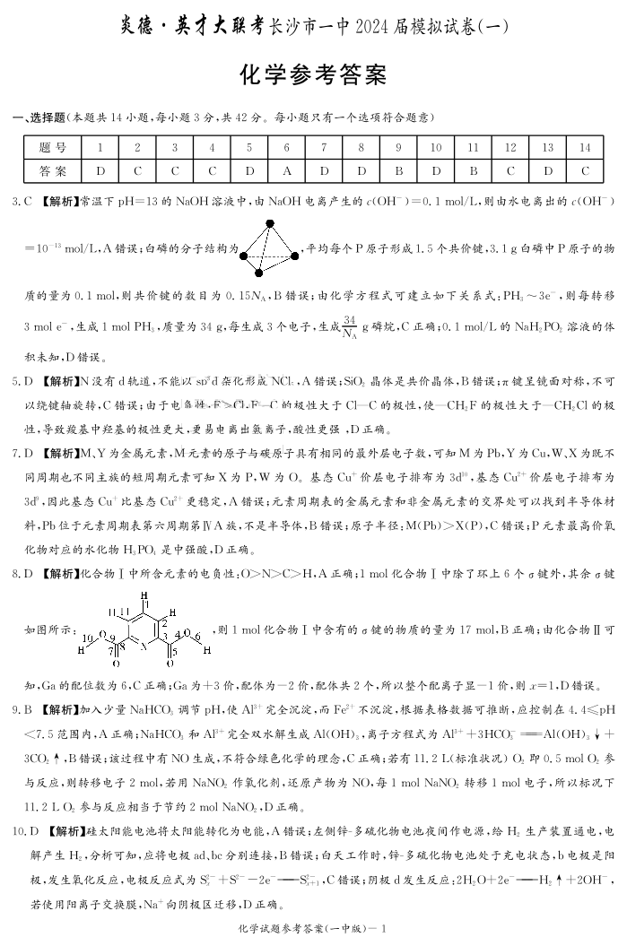 湖南省长沙市第一中学2024届高三模拟考试(一)化学答案