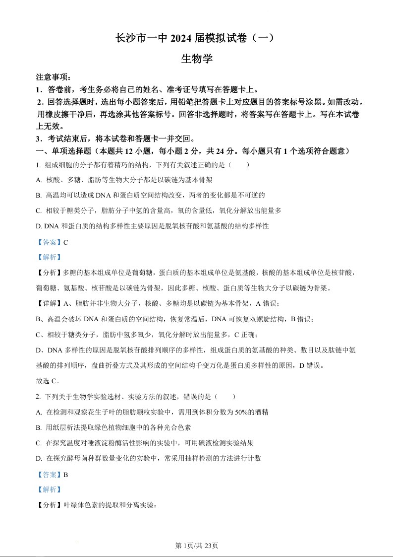 湖南省长沙市第一中学2024届高三模拟考试(一)生物(精品解析版)