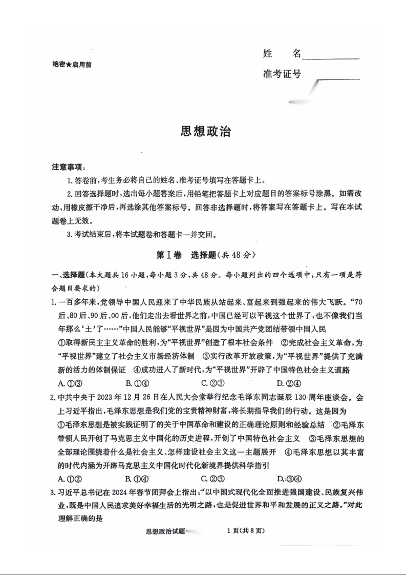 湖南省长沙市第一中学2024届高三模拟考试(一)政治