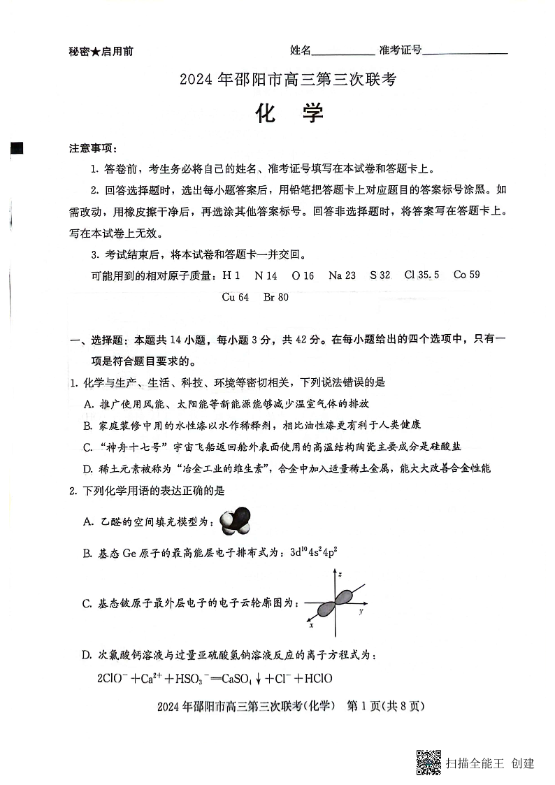 湖南省邵阳市2024届高三第三次联考化学