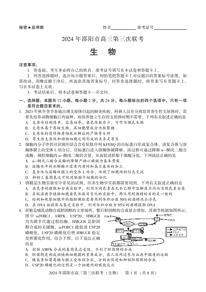 湖南省邵阳市2024届高三第三次联考生物