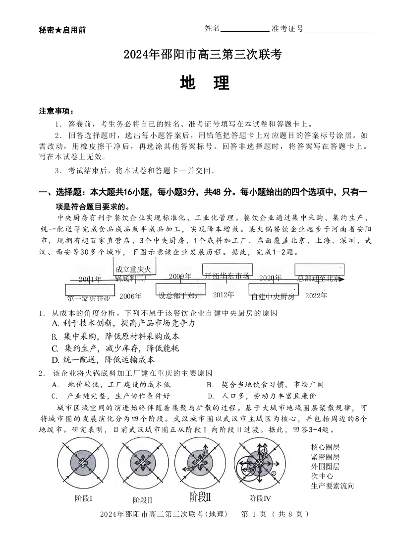 湖南省邵阳市2024届高三第三次联考地理