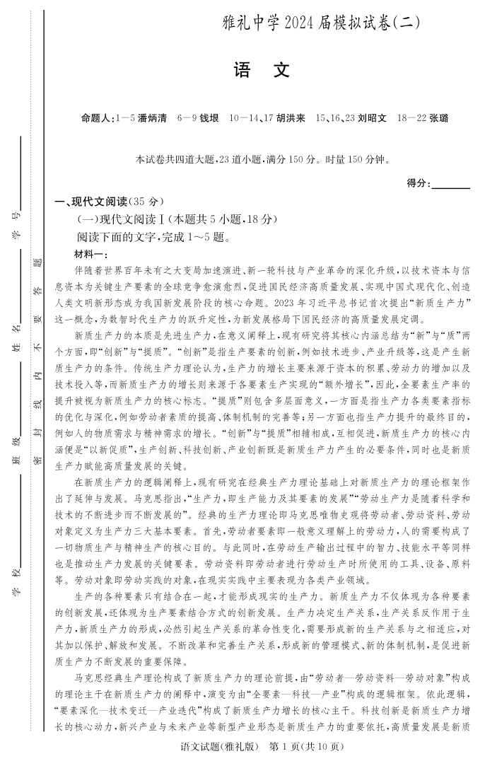 湖南省雅礼中学2024届高三下学期模拟考(二)语文