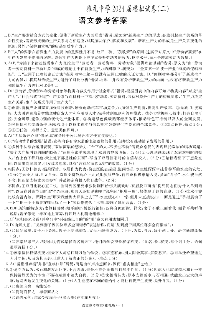 湖南省雅礼中学2024届高三下学期模拟考(二)语文答案