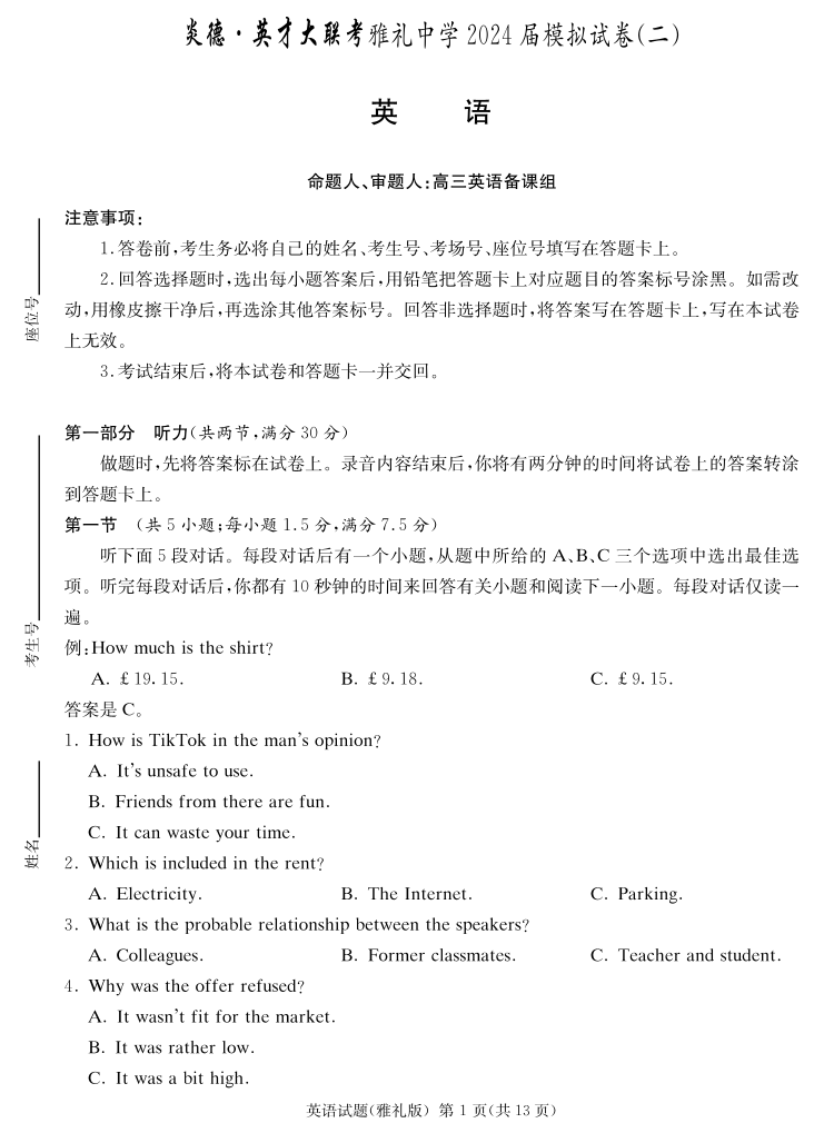湖南省雅礼中学2024届高三下学期模拟考(二)英语