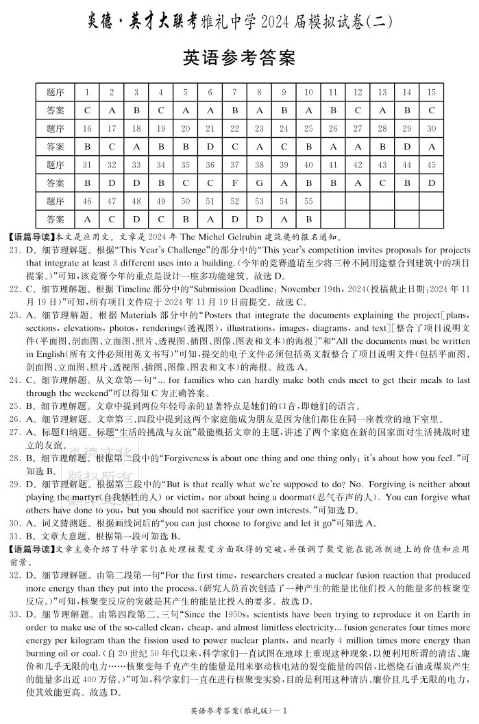 湖南省雅礼中学2024届高三下学期模拟考(二)英语答案