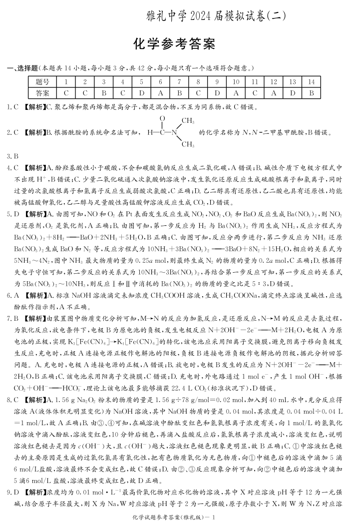 湖南省雅礼中学2024届高三下学期模拟考(二)化学答案