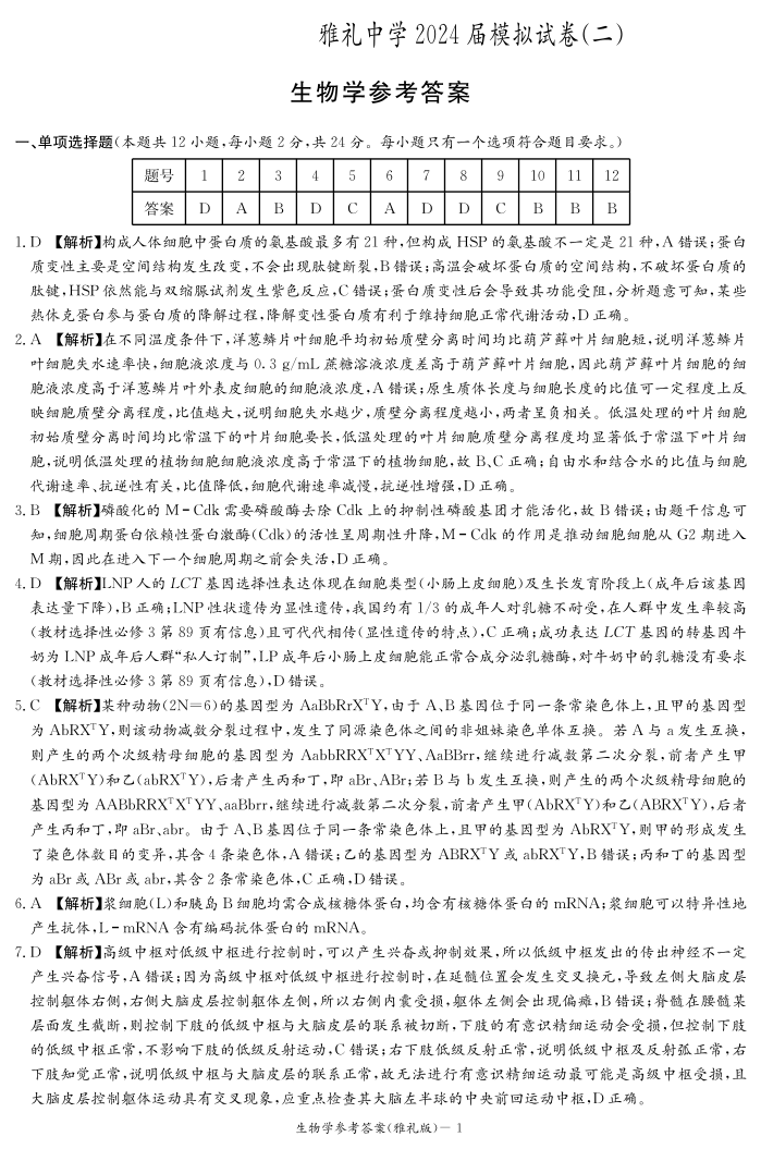 湖南省雅礼中学2024届高三下学期模拟考(二)生物答案