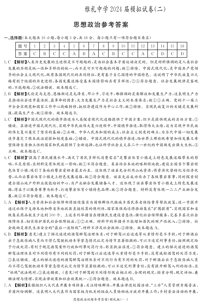 湖南省雅礼中学2024届高三下学期模拟考(二)政治答案