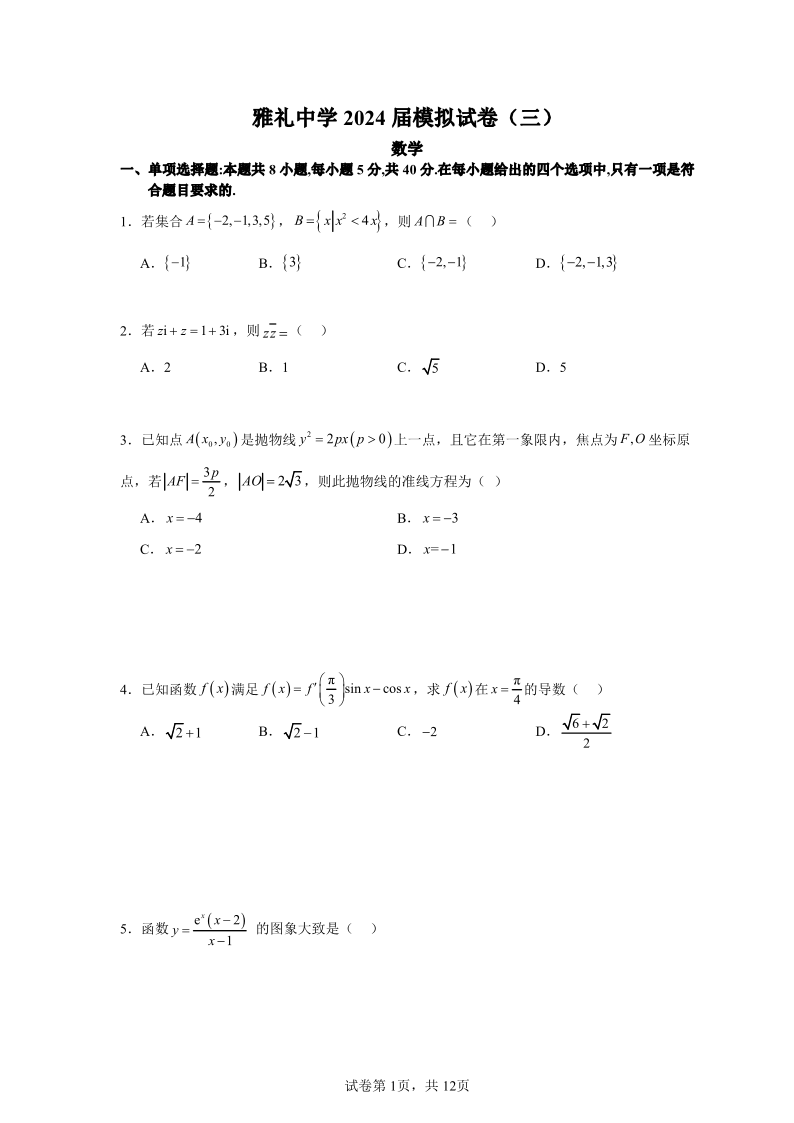 湖南省雅礼中学2024届高三下学期模拟考(三)数学(原卷版)