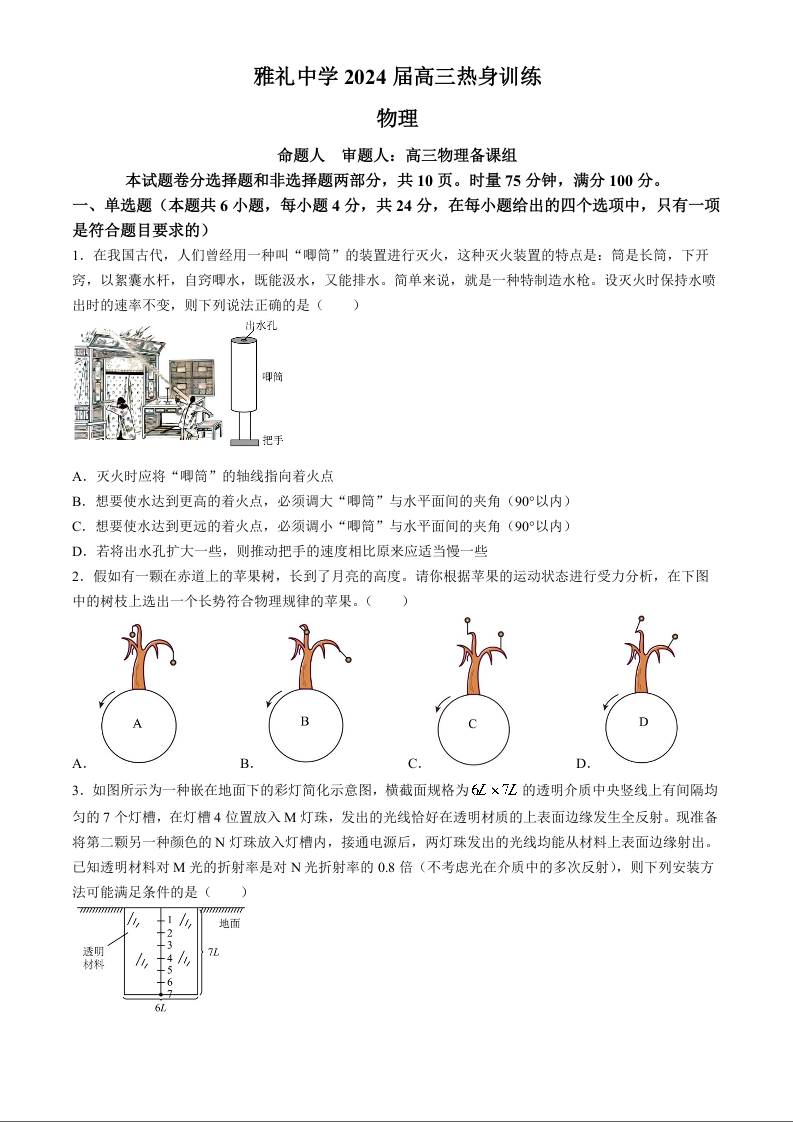 湖南省雅礼中学2024届高三下学期模拟考(三)物理+答案