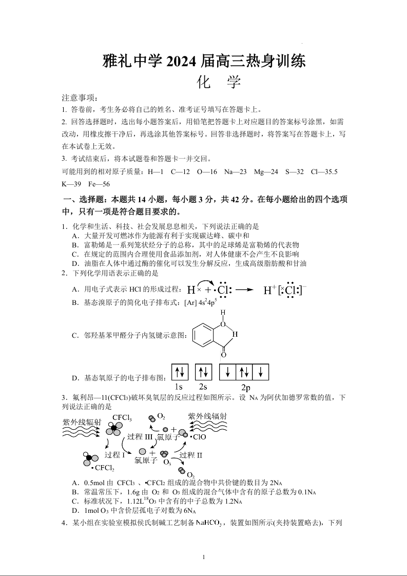 湖南省雅礼中学2024届高三下学期模拟考(三)化学(原卷版)