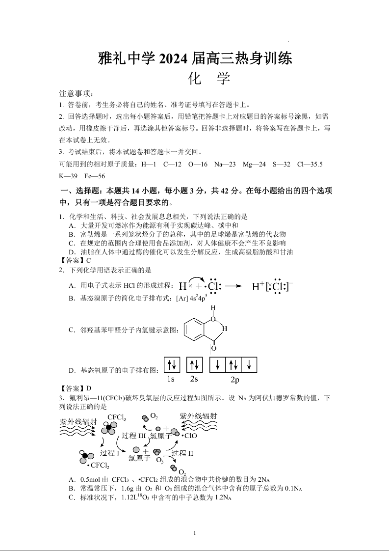 湖南省雅礼中学2024届高三下学期模拟考(三)化学(精品解析版)