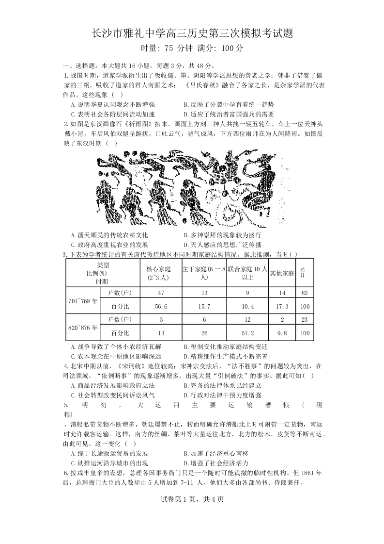 湖南省雅礼中学2024届高三下学期模拟考(三)历史