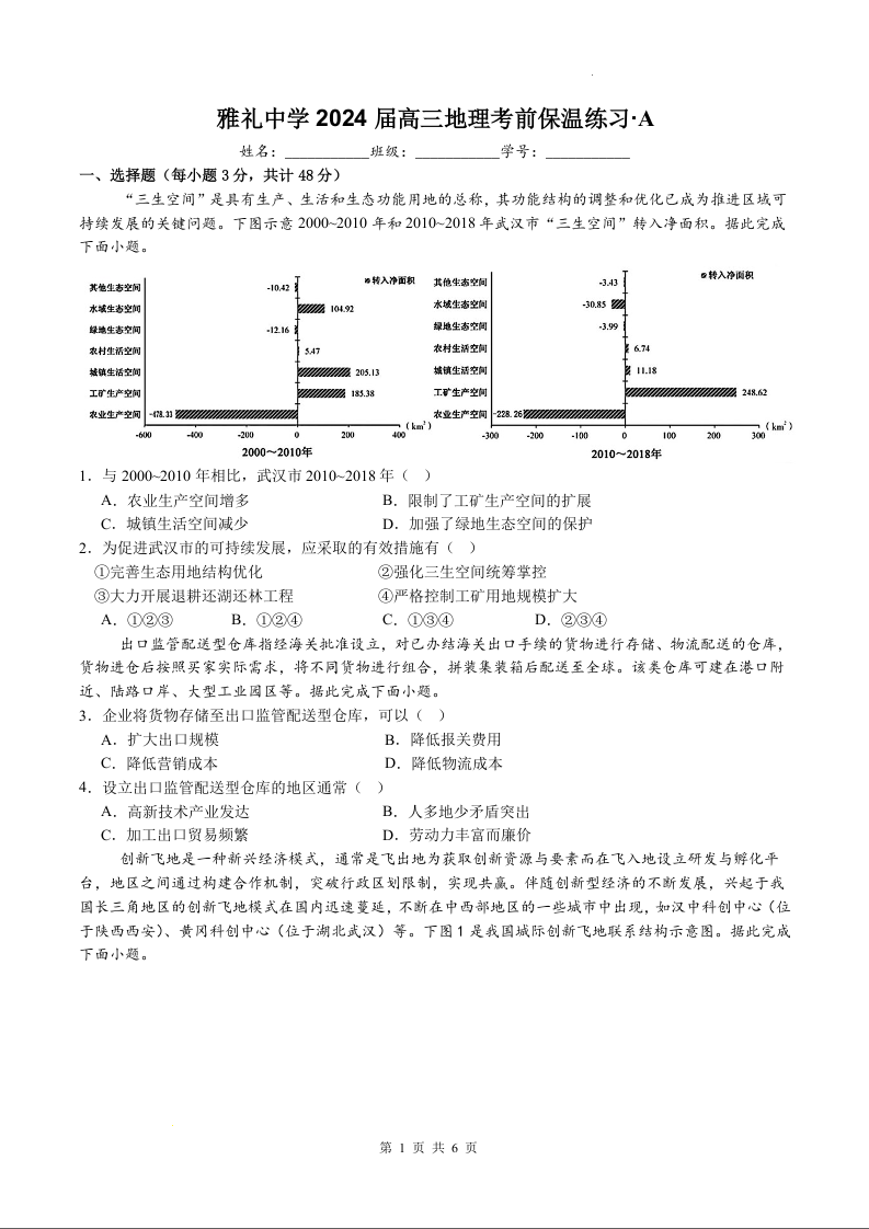 湖南省雅礼中学2024届高三下学期模拟考(三)地理