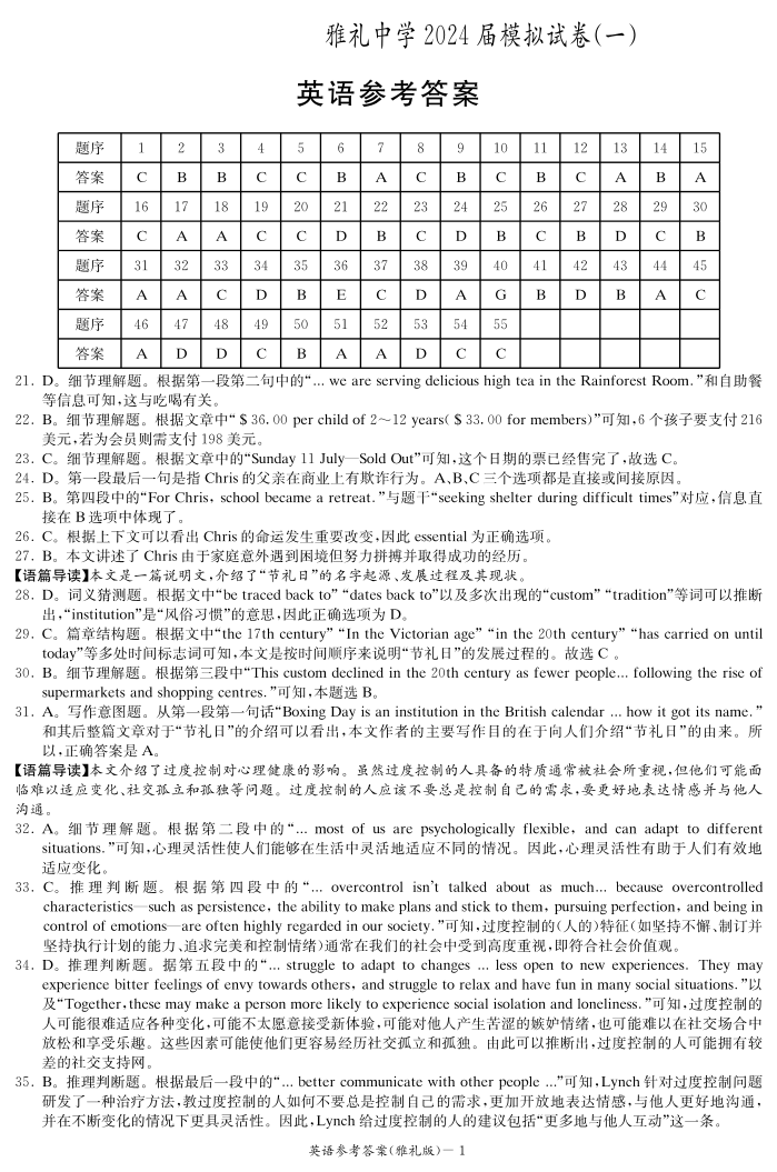 湖南省雅礼中学2024届高三下学期模拟考(一)英语答案