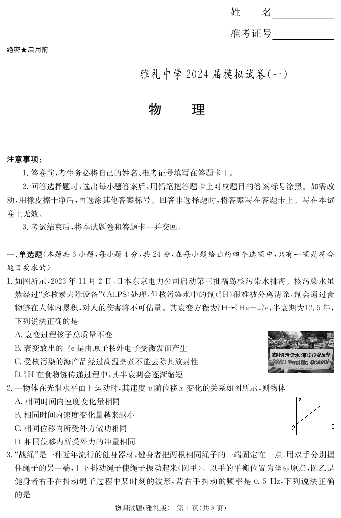 湖南省雅礼中学2024届高三下学期模拟考(一)物理