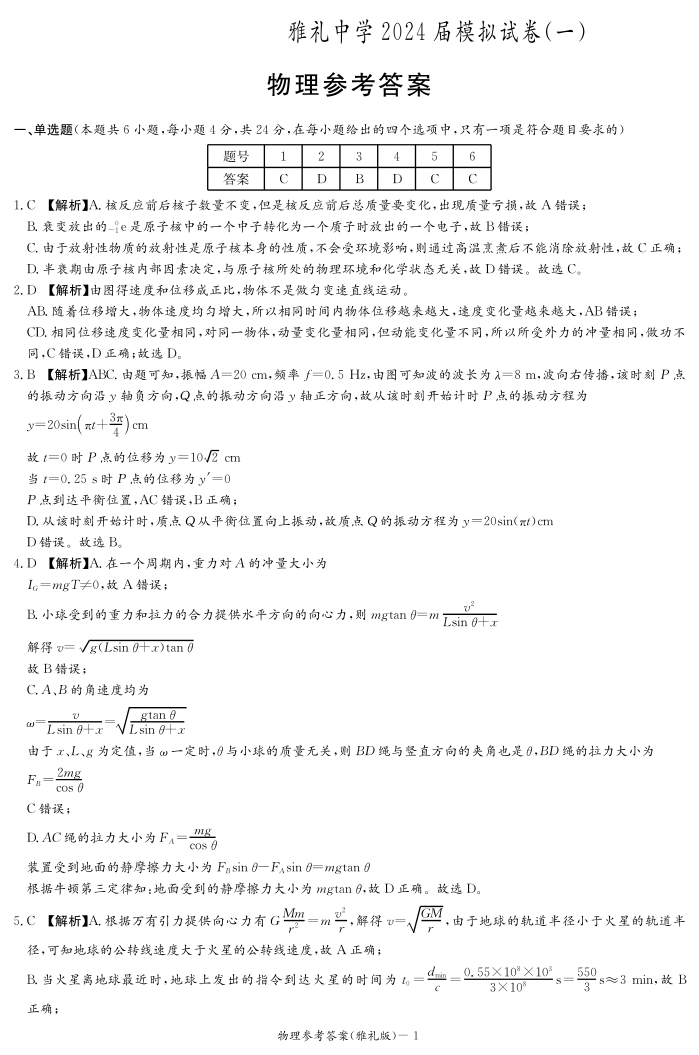 湖南省雅礼中学2024届高三下学期模拟考(一)物理答案