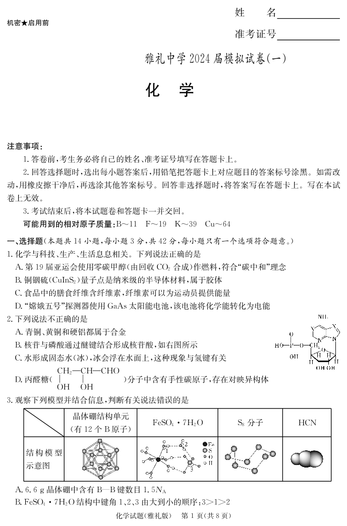 湖南省雅礼中学2024届高三下学期模拟考(一)化学