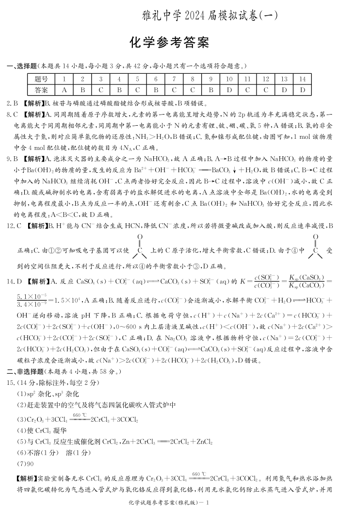 湖南省雅礼中学2024届高三下学期模拟考(一)化学答案