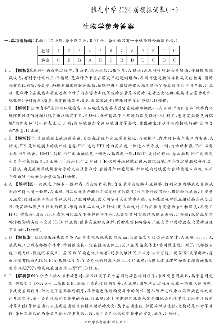 湖南省雅礼中学2024届高三下学期模拟考(一)生物答案