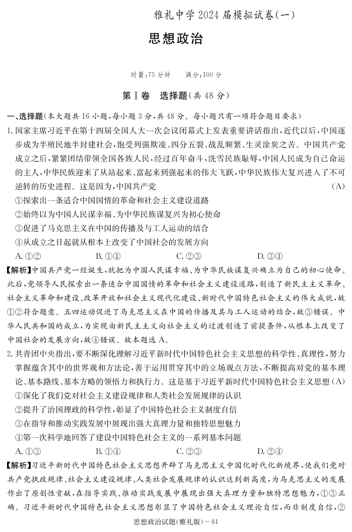 湖南省雅礼中学2024届高三下学期模拟考(一)政治