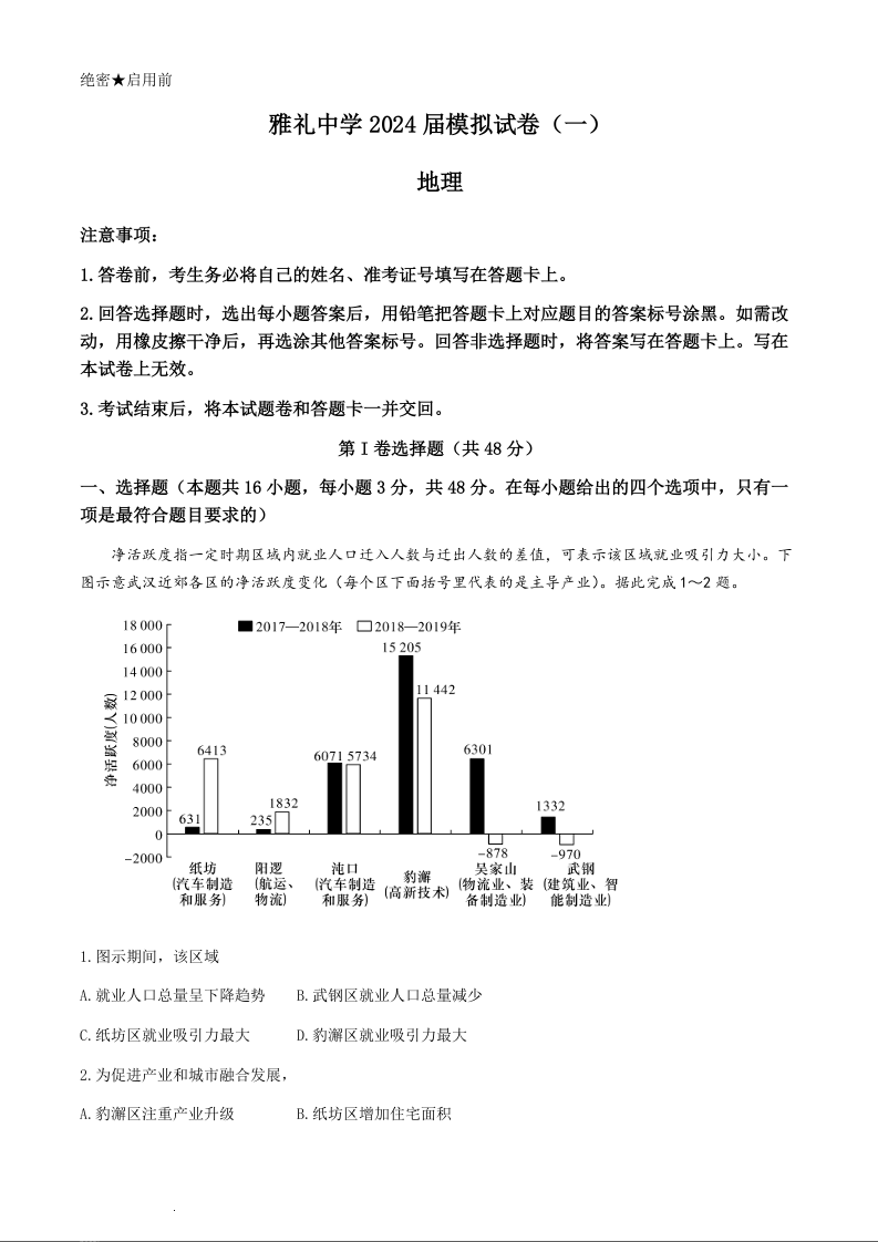 湖南省雅礼中学2024届高三下学期模拟考(一)地理+答案
