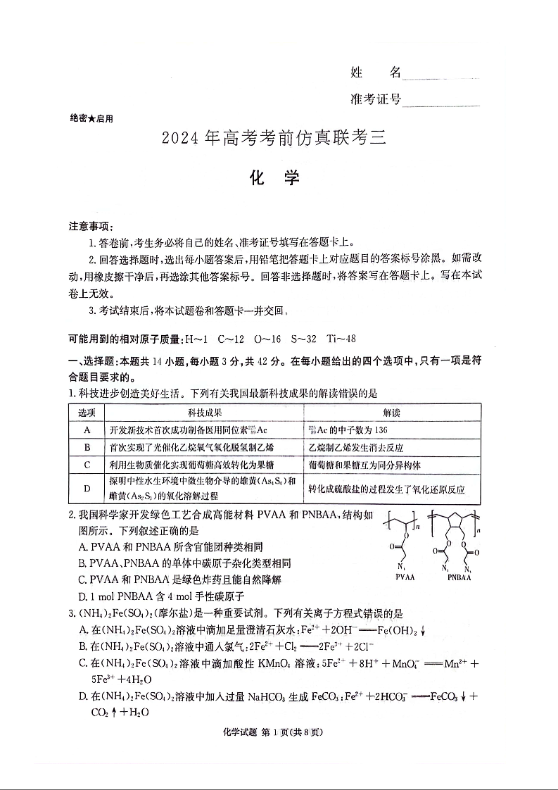 湖南省炎德2024届高三5月考前仿真联考(三)化学