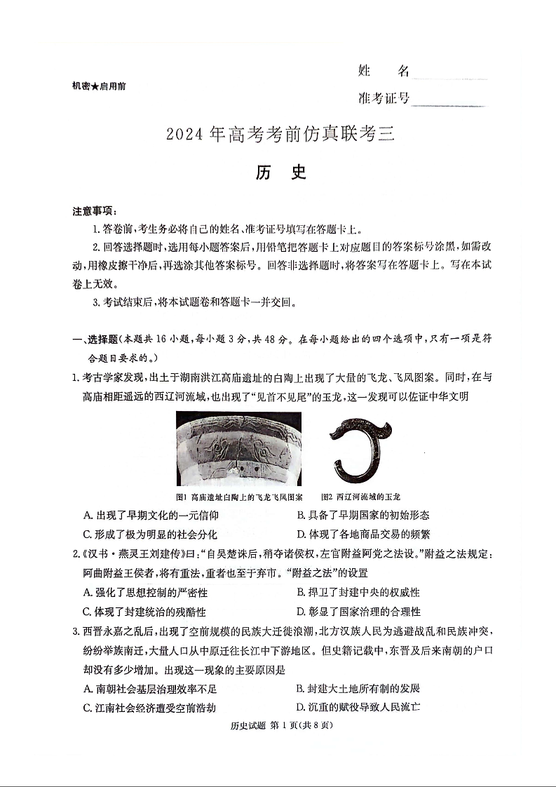 湖南省炎德2024届高三5月考前仿真联考(三)历史