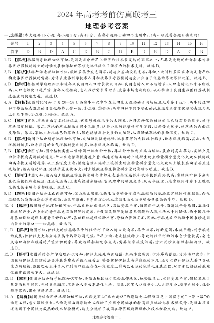 湖南省炎德2024届高三5月考前仿真联考(三)地理答案