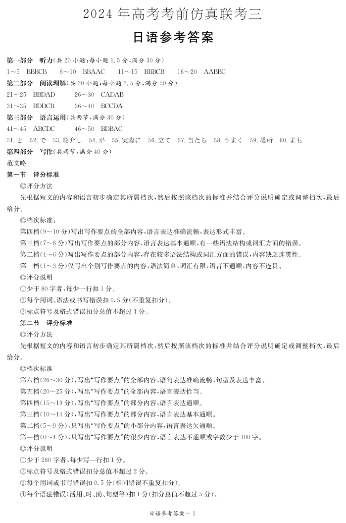 湖南省炎德2024届高三5月考前仿真联考(三)日语答案