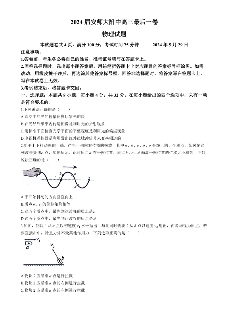安徽师范大学附属中学2024届高三下学期最后一卷(三模)物理