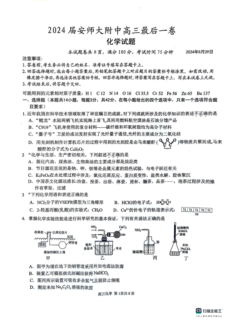 安徽师范大学附属中学2024届高三下学期最后一卷(三模)化学