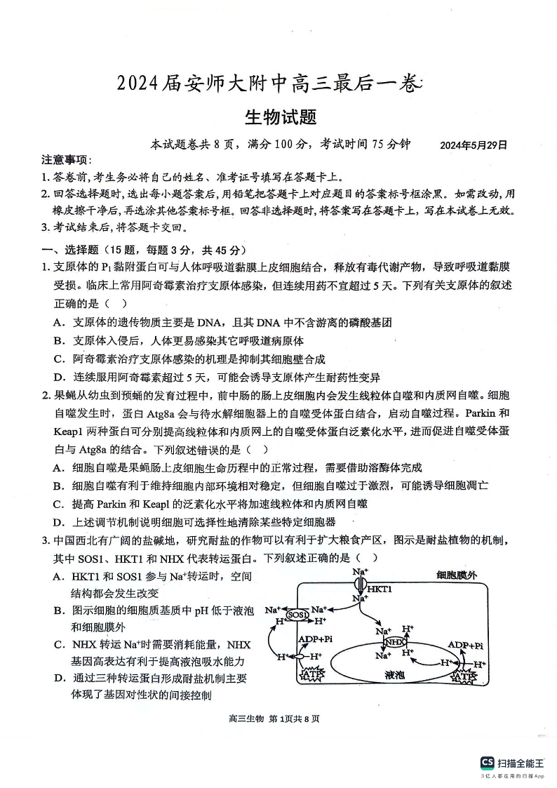 安徽师范大学附属中学2024届高三下学期最后一卷(三模)生物