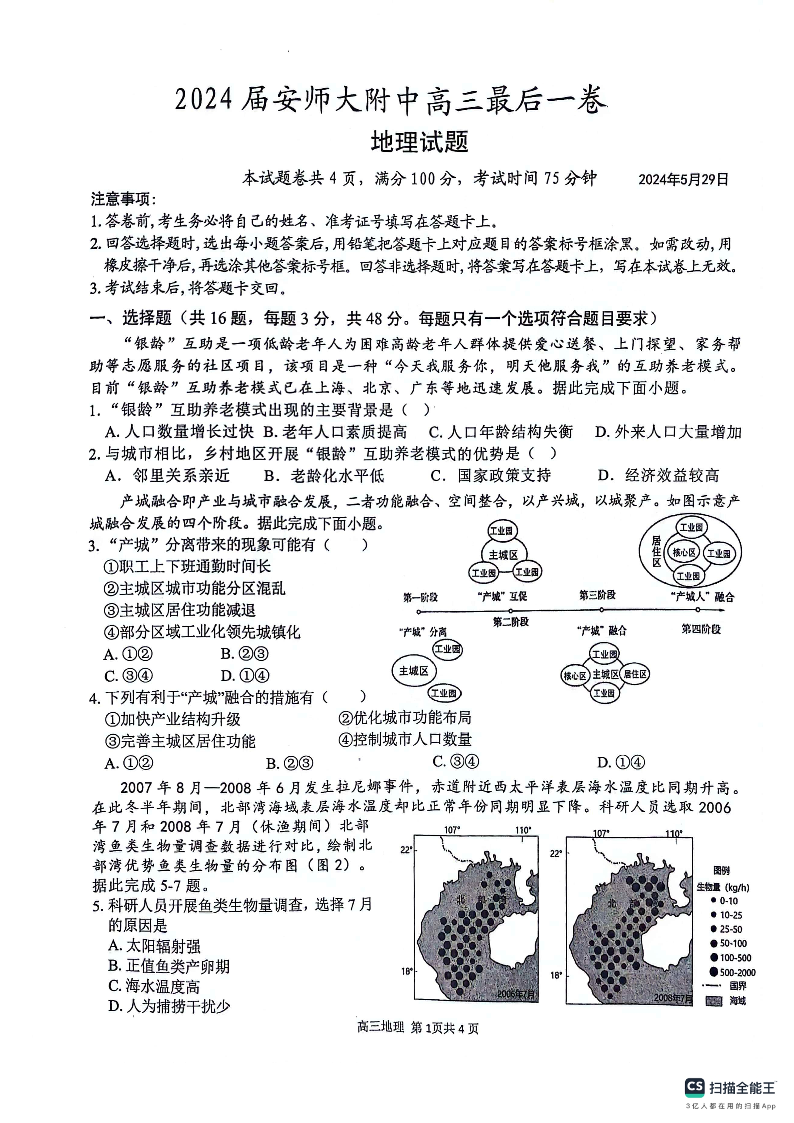 安徽师范大学附属中学2024届高三下学期最后一卷(三模)地理