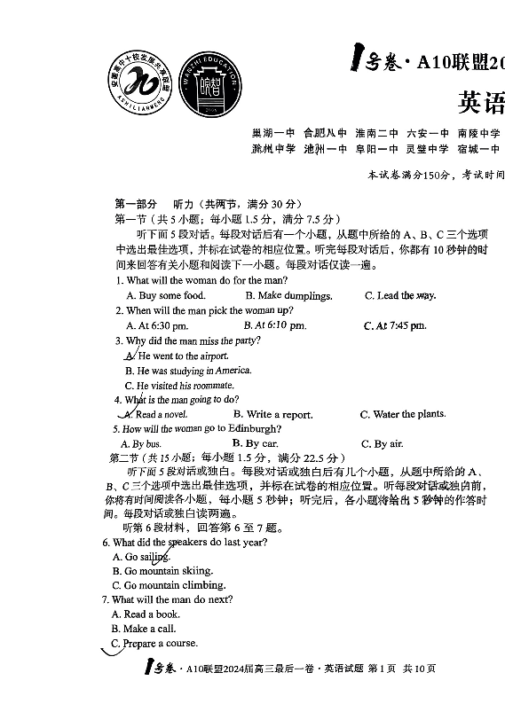 安徽省1号卷A10联盟2024届高三最后一卷英语