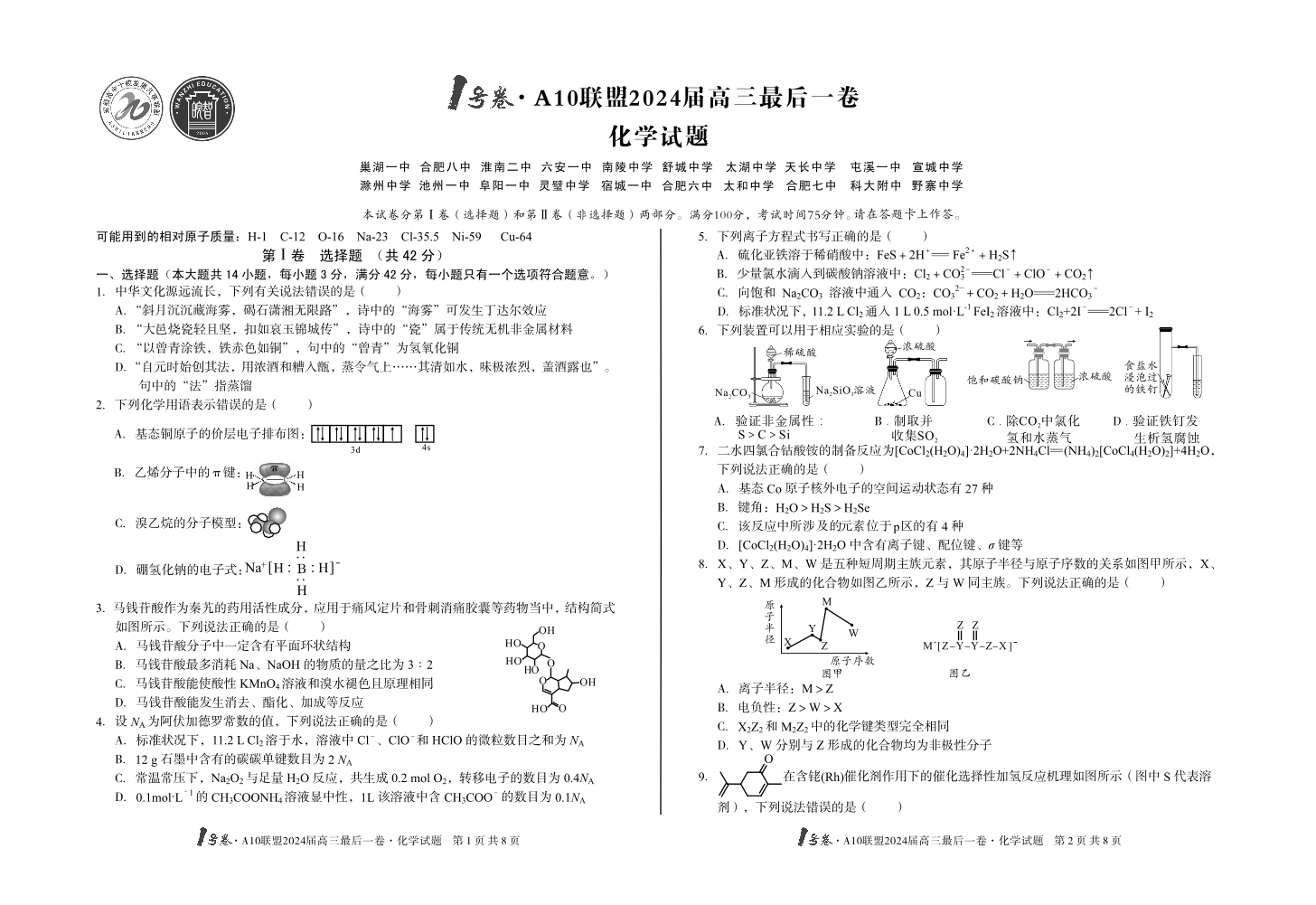 安徽省1号卷A10联盟2024届高三最后一卷化学