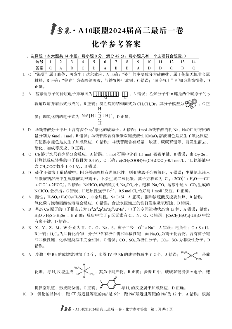 安徽省1号卷A10联盟2024届高三最后一卷化学答案