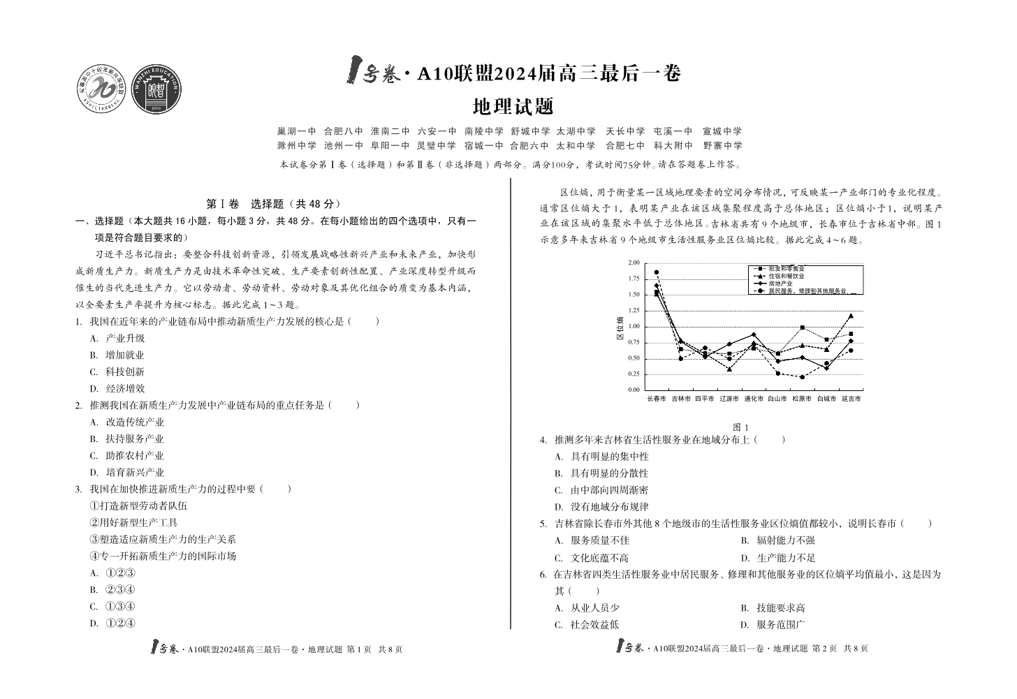 安徽省1号卷A10联盟2024届高三最后一卷地理