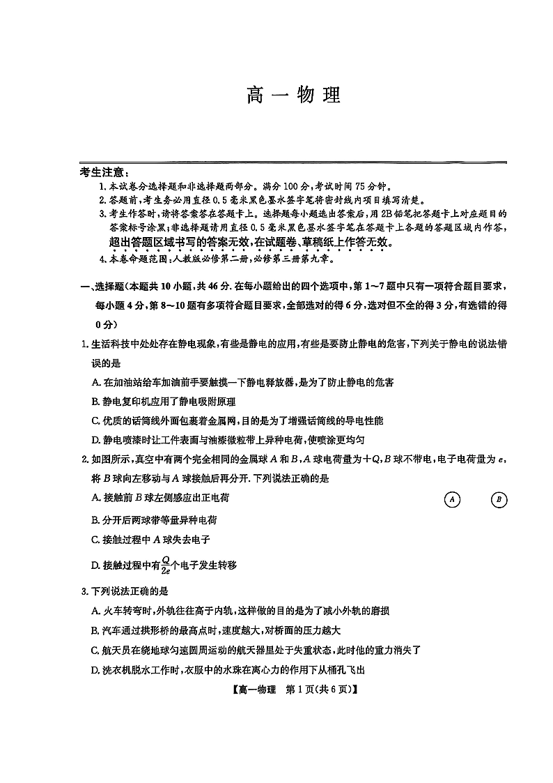 高一物理+答案--辽宁省九师联盟2024-2025学年高一下学期7月期末联考