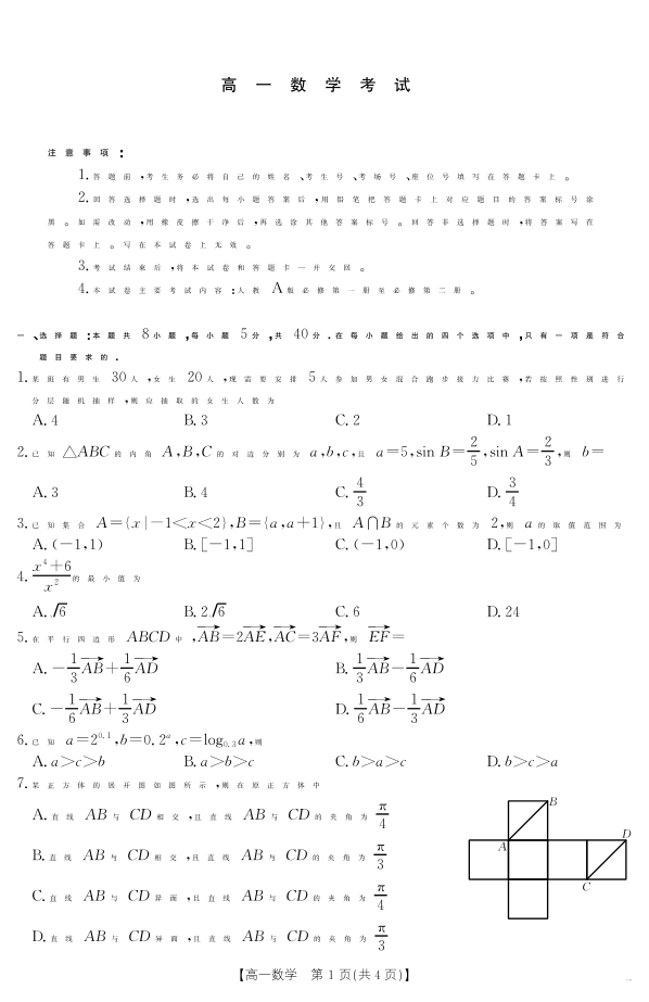 高一数学--内蒙古2024-2025学年高一下学期7月联考